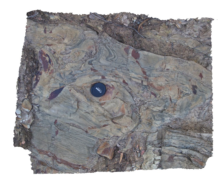 | Description: | thinly layered bands in sandstone with soft sediment folding. |