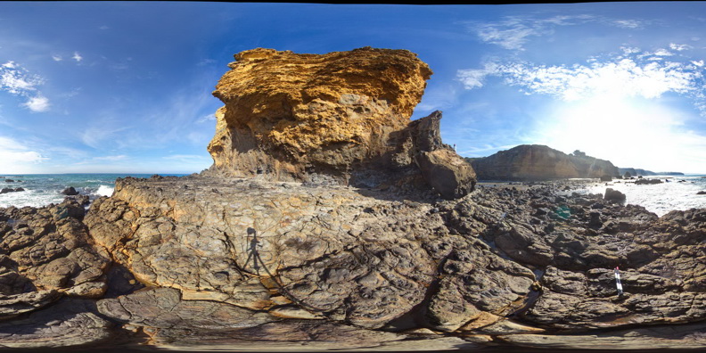 | Description: | dark grey basalt displaying spheroidal weathering. |