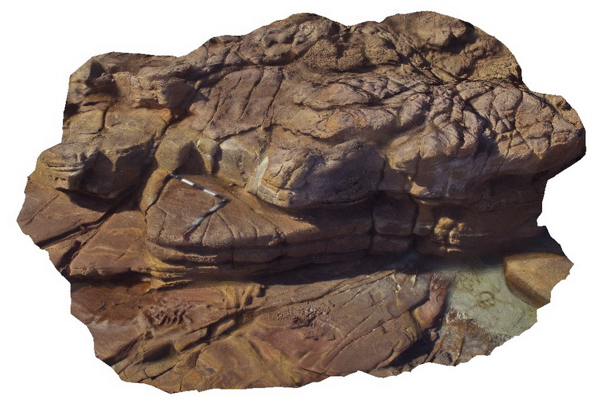 | Description: | Red-brown to orange arkose. Abundant trough cross-bedding, planar and slumped bedding. Thick beds with tabular foresets and convoluted bedding. |