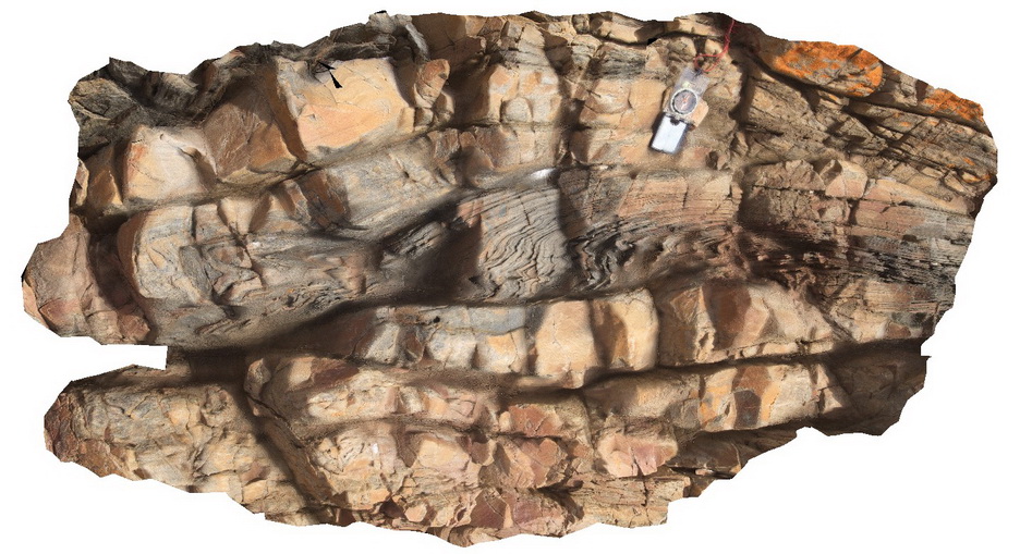 | Description: | Red-brown to orange arkose. Abundant trough cross-bedding, planar and slumped bedding. Thick beds with tabular foresets and convoluted bedding. |