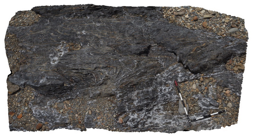 | Description: | Undifferentiated mylonitised Kanmantoo Group metasediment: Strongly foliated, recrystallised, fine to medium-grained, grey quartz mylonite and phyllite. Abundant deformation features include anastomosing mylonitic foliation, boudinaged layering. |